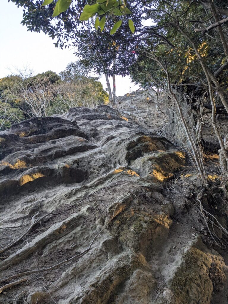 小保田峠から先は稜線歩きです。が標高にして30mほどのアップダウンが白狐峠まで続きます。途中、房総半島特有の砂岩と泥岩の地層が出てきます。やわらかい泥岩層が削られ固い砂岩層だけ残って特有の景観が広がります。。